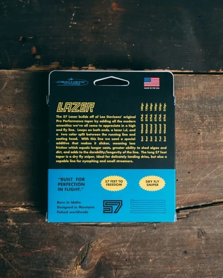 Lee originally designed the Pro Performance taper for instruction. However the taper has proven to be a great line for throwing long casts and choosy fish. So whether you are just looking for an improved quality of the original Pro Performance taper or you want a line made more for fishing then the Lazer 57 is the right choice. This line has a 57 foot head so that you can carry a lot of line on your hulls. The new Lazer 57 has the highest technology in both floatability and durability and it is made in USA. This new version of the Pro Performance also now has micro loops on both ends and lazer engraving for an easy I.D. of which line you have on. We love the color combo which is half “Forest Service Green” and “Vector Blue”. This line is for experienced casters and dry fly anglers and we hope you love it.